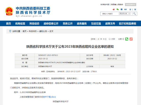 2023年10月12日,陜西省科學技術廳公布了《2023年陜西省瞪羚企業名單》,經過嚴密...